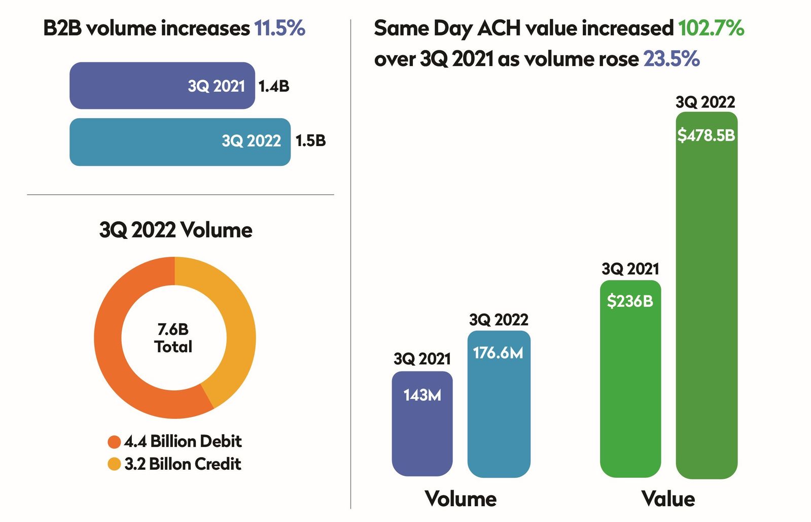 The value of same day ACH payments touched $478.5 billion in Q3 2022. This corresponds to a 102.7% rise from a year ago.